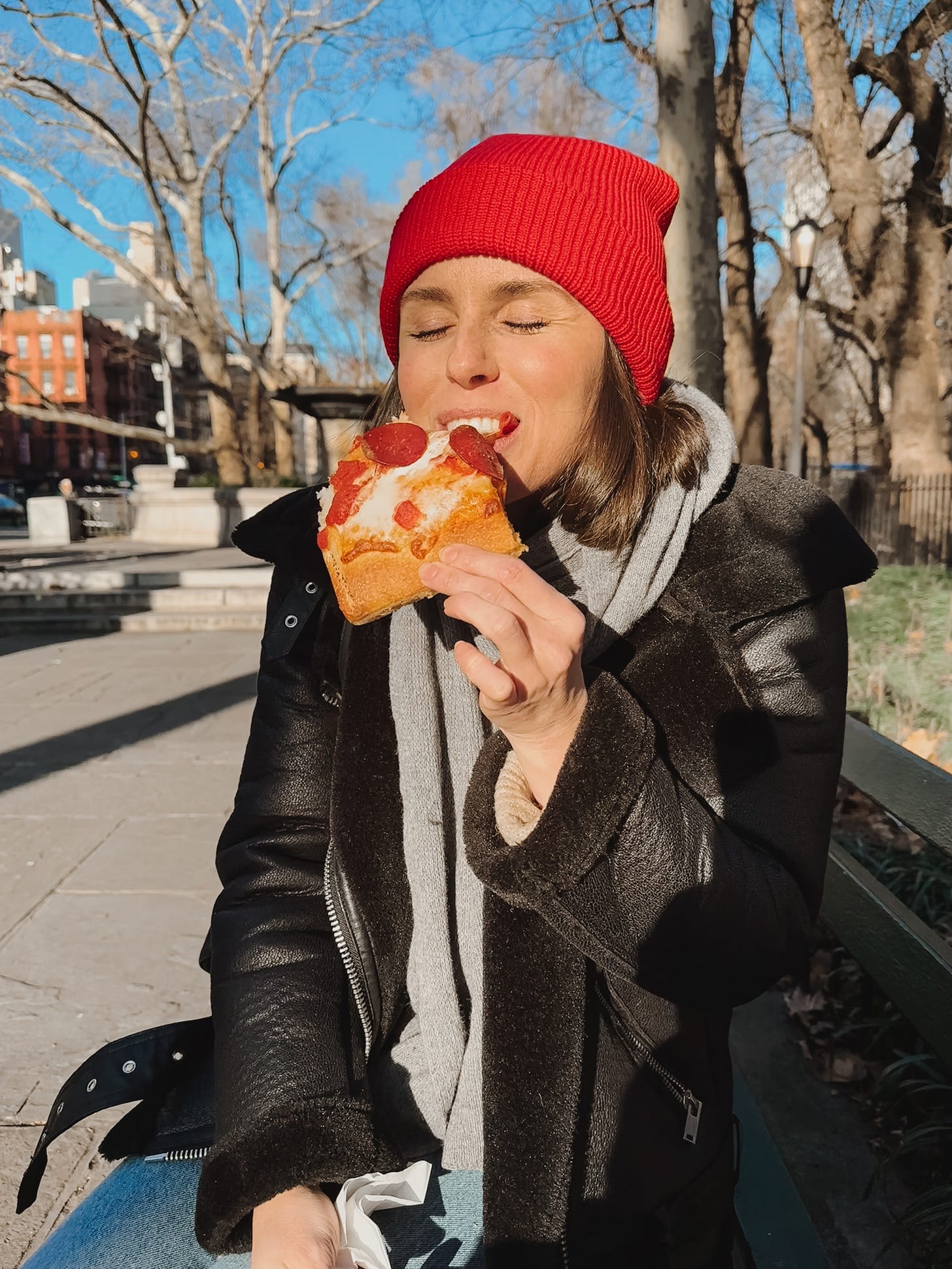 You know it’s a legit pizza spot in NY when there are a couple of small tables outside and people are standing in the cold to eat a slice. There are a handful of pizza places that are considered “of the best” and this is one of them for a reason. We waited in a (short) line and got one of each style— a plain traditional cheese thin crust and a thicker Sicilian pepperoni square. Both were delicious.